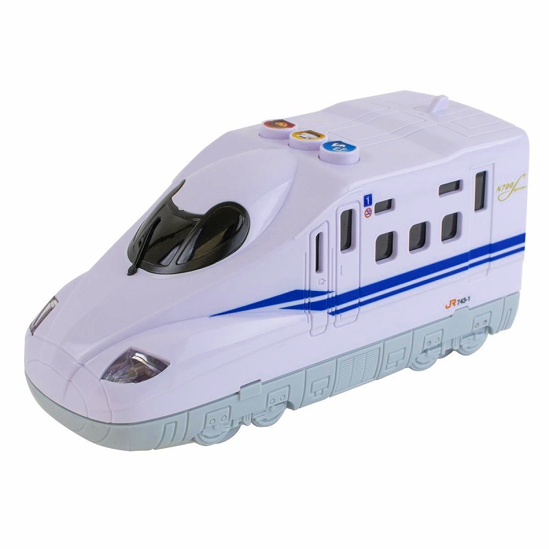本物の新幹線をかわいらしくデフォルメしました。ライトが光る!車内アナウンスと行先をアナウンス! 新幹線走行音! 童謡のメロディも流れます。