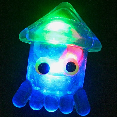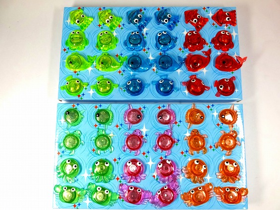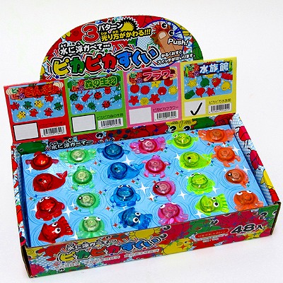 グミ状の胴体の中にあるスイッチを押すと、青・赤・緑のライトが点滅します。スイッチを押す毎に光り方が変わります(3パターン)。4回目がスイッチOFFとなります。水に浮くので、スーパーボールすくいにも使えます。マンボー、カメ、カニ、タコ、クジラ、イカ、ペンギン、フグの8種6色アソートの48個入りです。電池交換はできません。ハーフ買い・バラ買いでもできます。バラ買い場合は種類・色指定はできません