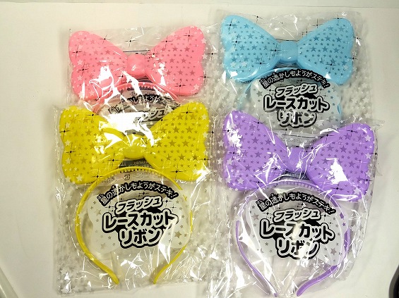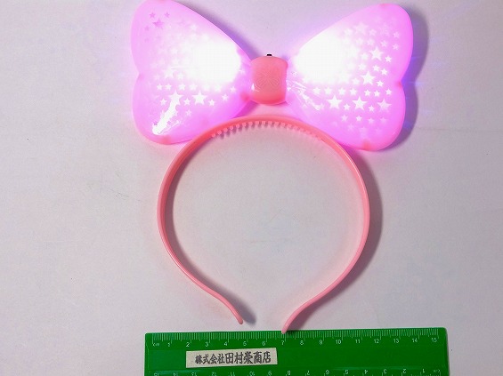 スイッチを入れると、リボンの部分が点滅します。リボンに透かし模様が入っているので光が綺麗に映えます。サイズは小顔の大人ならかぶれます。