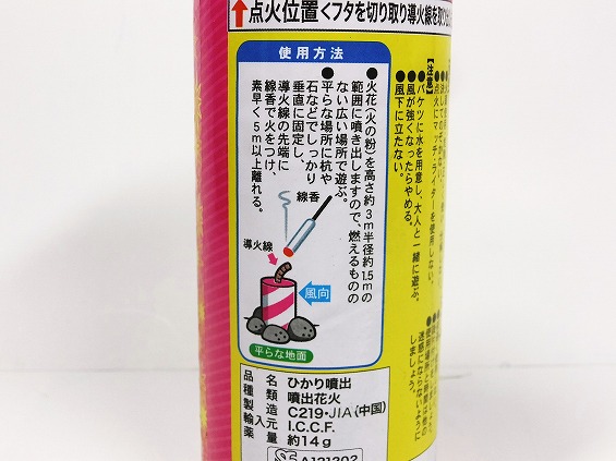 この花火は、キラキラと火花が点滅して、長く(約18秒)噴出します。高さ約3m、半径約1.5mの範囲で噴き出します。