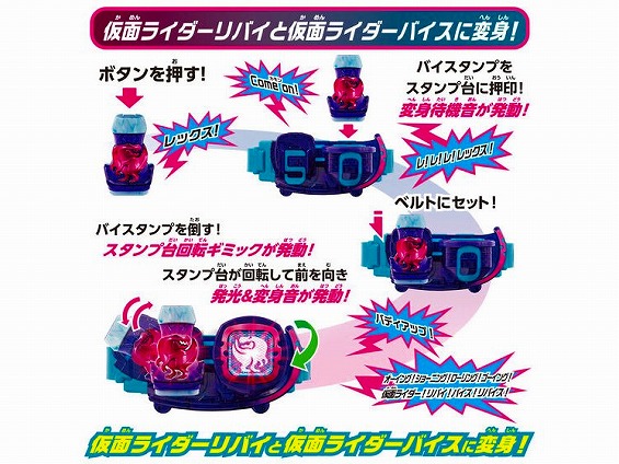 また、別売りのバイスタンプをセットして、様々なフォームへの変身遊びも楽しめます。