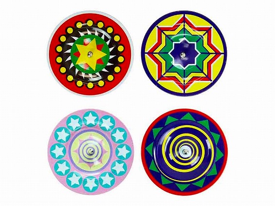 プラスチックの底ときれいなプリントのしたブリキの上部を合わせたこまです。軽いこまなので回しやすいです。バラ買い箱買いどちらでもお求めいただけます。箱買いの場合 4柄アソート12個入り。バラ買いの場合柄指定はできません。