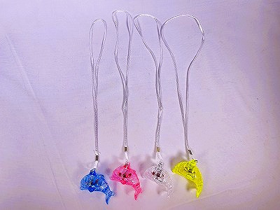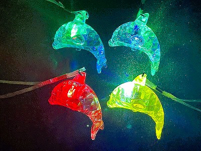 ダイヤモンドカットで光が乱反射するイルカ型のペンダントです。スイッチを押すと赤・青・ミドリのライトが点滅します。スイッチを押す毎に光り方が変わります。(3パターン)4回目に点滅が消えます。紐の長さ約70センチ。首からぶら下げられます。